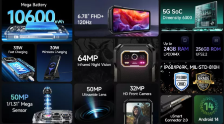 Pantalla de 6.78″ FullHD+ – Tasa de refresco de 120 Hz – Triple certificado de resistencia IP68, IP69K y MIL-STD-810H – Procesador MediaTek Dimensity 6300 5G – 12GB de RAM – 256GB de capacidad – Triple cámara trasera de 50 Mpx con visión nocturna – Redes 5G – Conector uSmart 2.0 – Enorme batería de 10600 mAh – Android 14